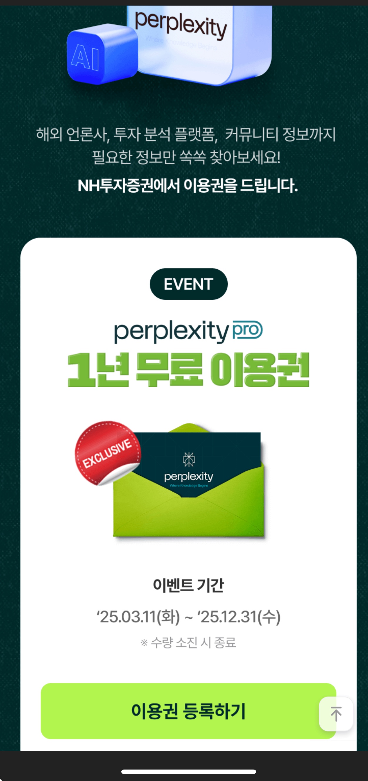 나무증권(NH투자증권)에서 AI 기반 검색 서비스 퍼플렉시티 프로(Perplexity Pro)의 1년 무료 구독권을 제공하는 이벤트를 진행 중입니다. 이 서비스는 해외 주식 정보를 분석·번역하여 투자자들에게 유용한 데이터를 제공합니다.이벤트 신청 방법퍼플렉시티 프로 1년 무료 이용 혜택을 받기 위해서는 아래 절차를 따라 신청하면 됩니다. 1. 나무증권 또는 NH투자증권 QV 앱 실행 2. 로그인 후, 고객센터 > 공지/이벤트로 이동 3. 해당 이벤트 선택 후 신청 완료!이벤트 혜택이번 이벤트를 통해 투자자들은 다음과 같은 다양한 혜택을 받을 수 있습니다. • 퍼플렉시티 프로 1년 무료 이용(정가 약 29만 원 상당)이벤트 기간 및 유의사항이벤트는 2025년 연말까지 진행되며, 수량 소진 시 종료됩니다. ..